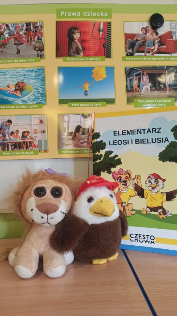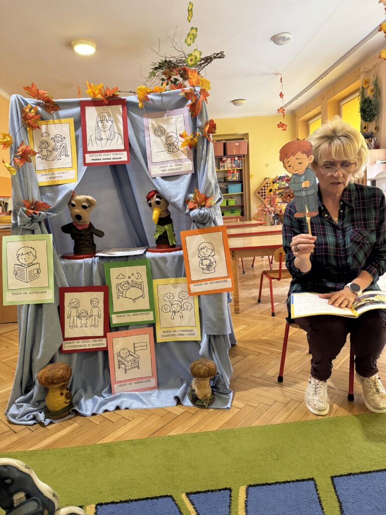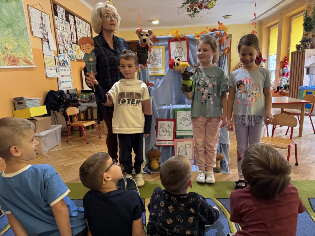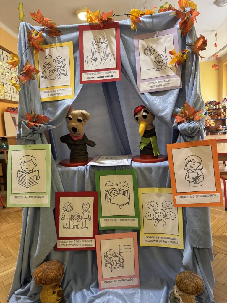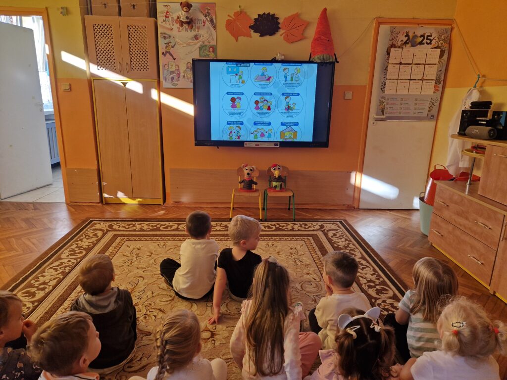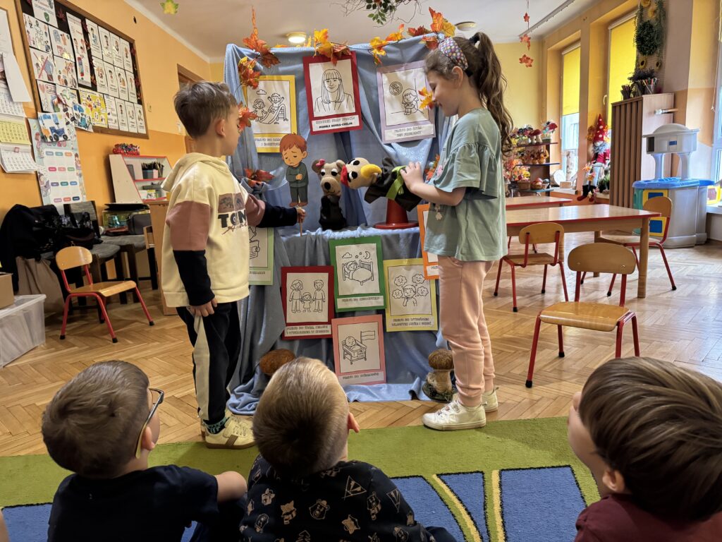 Dnia 14 listopada 2025r. obchodziliśmy w naszym przedszkolu Międzynarodowy Dzień Praw Dziecka. W każdej grupie wiekowej przeprowadzono zajęcia w oparciu o inscenizację pt.: „Bezpieczni w przedszkolu” (z „Elementarza Leosi i Bielusia”), z wykorzystaniem pacynek Leosi i Bielusia. Omówiono „Prawa Dziecka”; budowano poczucie bezpieczeństwa; pogłębiano rozumienie pojęć : szacunek, krzywdzenie, reagowanie, pomoc; kształtowano u dzieci postawę odpowiedzialności za życie i zdrowie swoje i innych. Dzieci rozpoznawały i nazywały emocje i uczucia takie jak radość i złość; aktywnie uczestniczyły w zajęciach, chętnie odgrywały scenki tematyczne.