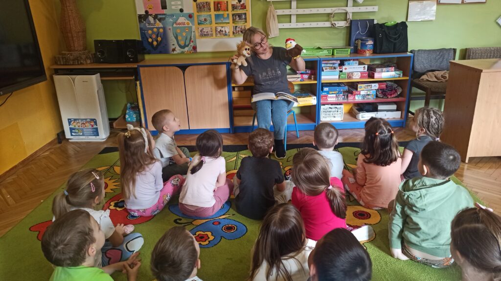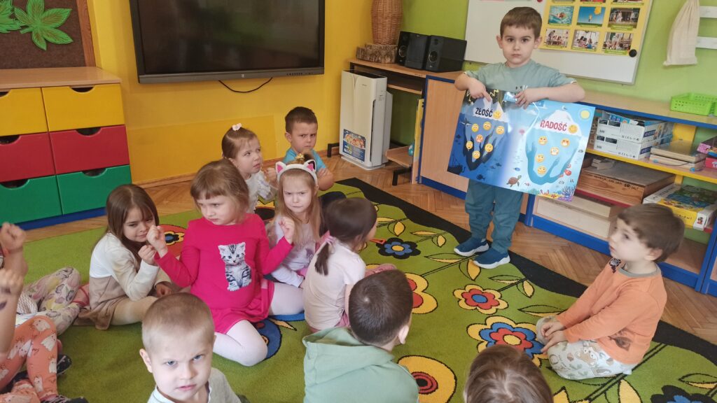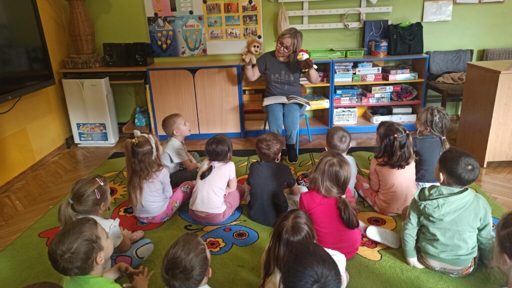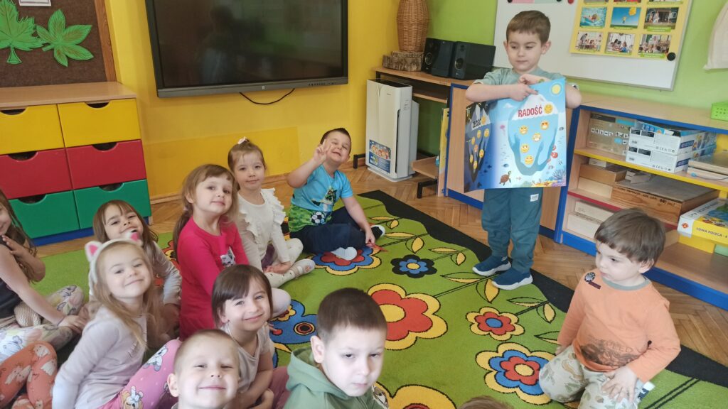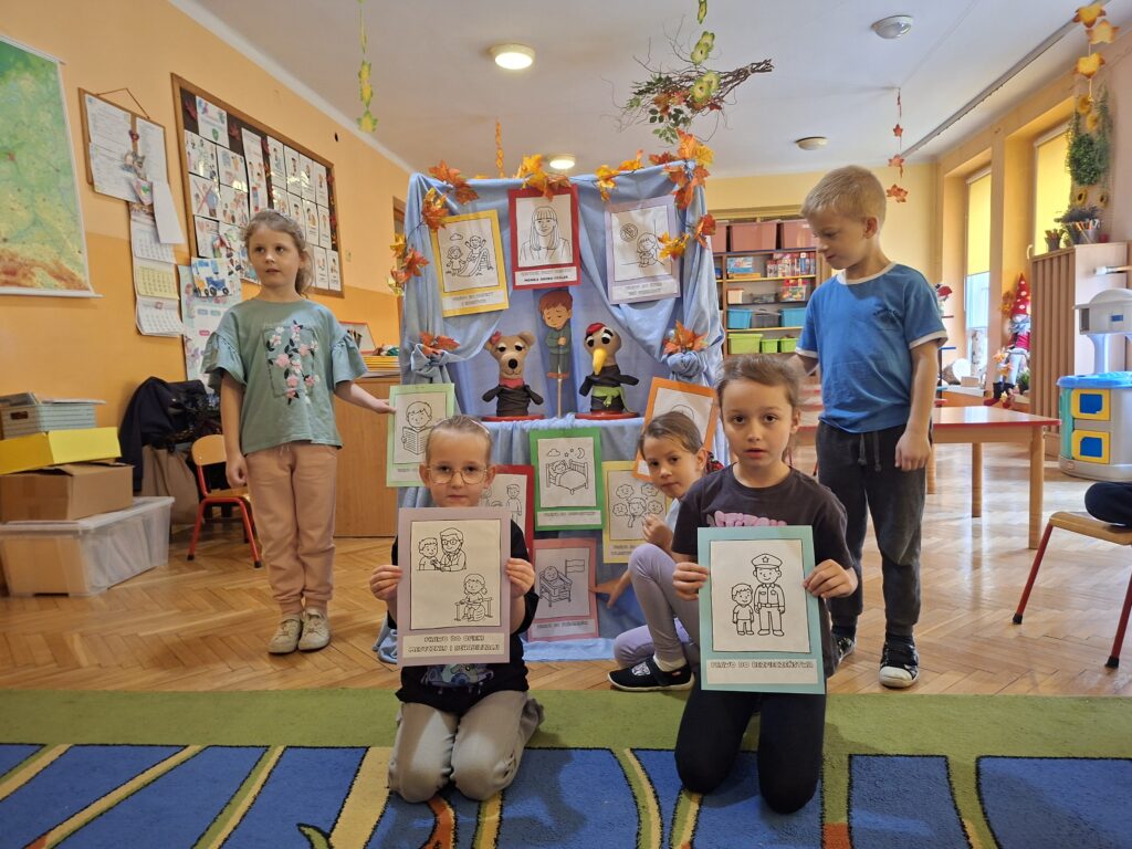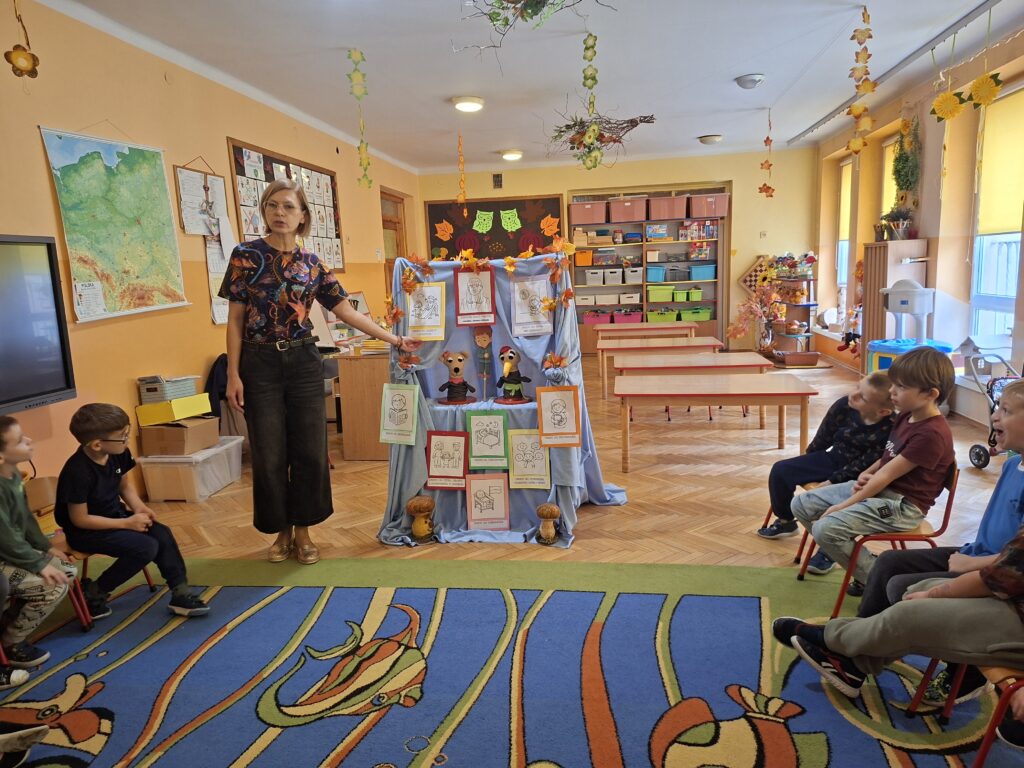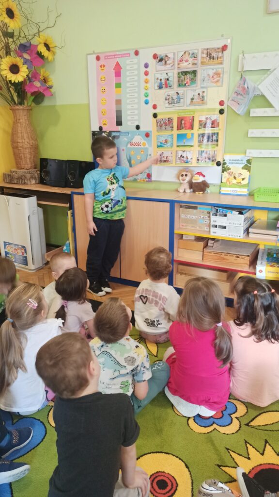 Dnia 14 listopada 2025r. obchodziliśmy w naszym przedszkolu Międzynarodowy Dzień Praw Dziecka. W każdej grupie wiekowej przeprowadzono zajęcia w oparciu o inscenizację pt.: „Bezpieczni w przedszkolu” (z „Elementarza Leosi i Bielusia”), z wykorzystaniem pacynek Leosi i Bielusia. Omówiono „Prawa Dziecka”; budowano poczucie bezpieczeństwa; pogłębiano rozumienie pojęć : szacunek, krzywdzenie, reagowanie, pomoc; kształtowano u dzieci postawę odpowiedzialności za życie i zdrowie swoje i innych. Dzieci rozpoznawały i nazywały emocje i uczucia takie jak radość i złość; aktywnie uczestniczyły w zajęciach, chętnie odgrywały scenki tematyczne.