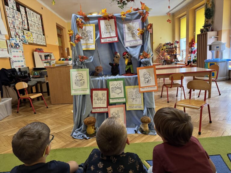 Dnia 14 listopada 2025r. obchodziliśmy w naszym przedszkolu Międzynarodowy Dzień Praw Dziecka. W każdej grupie wiekowej przeprowadzono zajęcia w oparciu o inscenizację pt.: „Bezpieczni w przedszkolu” (z „Elementarza Leosi i Bielusia”), z wykorzystaniem pacynek Leosi i Bielusia. Omówiono „Prawa Dziecka”; budowano poczucie bezpieczeństwa; pogłębiano rozumienie pojęć : szacunek, krzywdzenie, reagowanie, pomoc; kształtowano u dzieci postawę odpowiedzialności za życie i zdrowie swoje i innych. Dzieci rozpoznawały i nazywały emocje i uczucia takie jak radość i złość; aktywnie uczestniczyły w zajęciach, chętnie odgrywały scenki tematyczne.