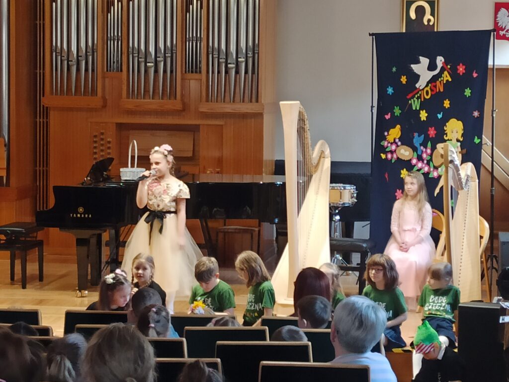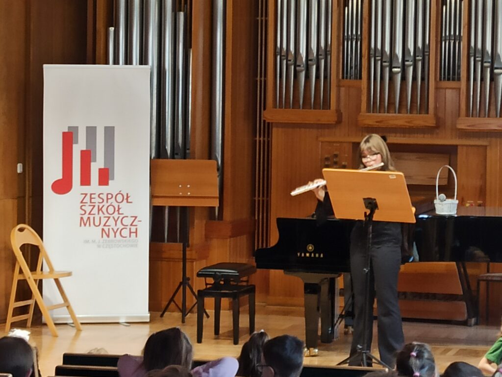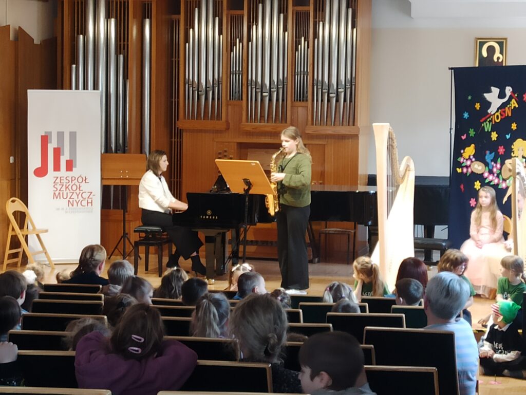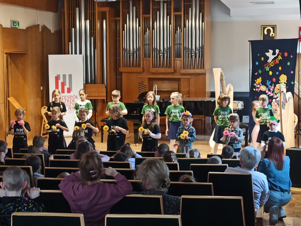 Dnia 13 marca 2026r. grupa Wiewiórek odbyła wycieczkę pieszą do Zespołu Szkół Muzycznych im. M. J. Żebrowskiego w Częstochowie, znajdującej się przy ulicy Jasnogórskiej 17. Dzieci miały okazję wysłuchać audycji muzycznej z okazji nadchodzącej wiosny, w wykonaniu uczniów tamtejszej szkoły. Ponadto przedszkolaki zobaczyły i usłyszały na żywo brzmienie wielu instrumentów muzycznych, między innymi: skrzypce, trąbka, saksofon, flet poprzeczny, fortepian, werbel, puzon, harfa, gitara i wiolonczela. Na koniec „Pani Wiosna” wraz z uczniami zaśpiewała piosenkę o nadchodzącej porze roku – Wiośnie. Cały występ nagrodziliśmy gromkimi brawami.