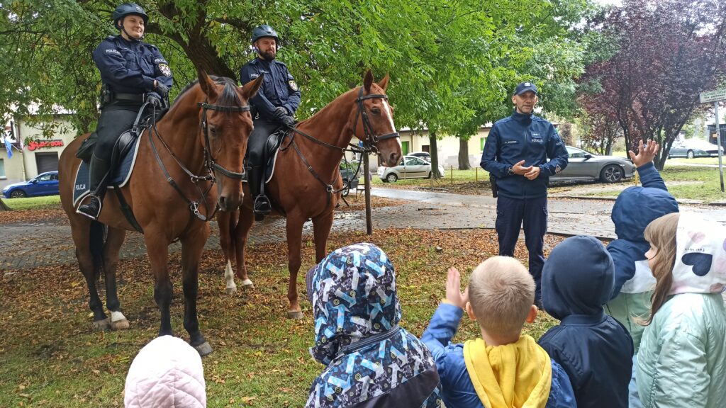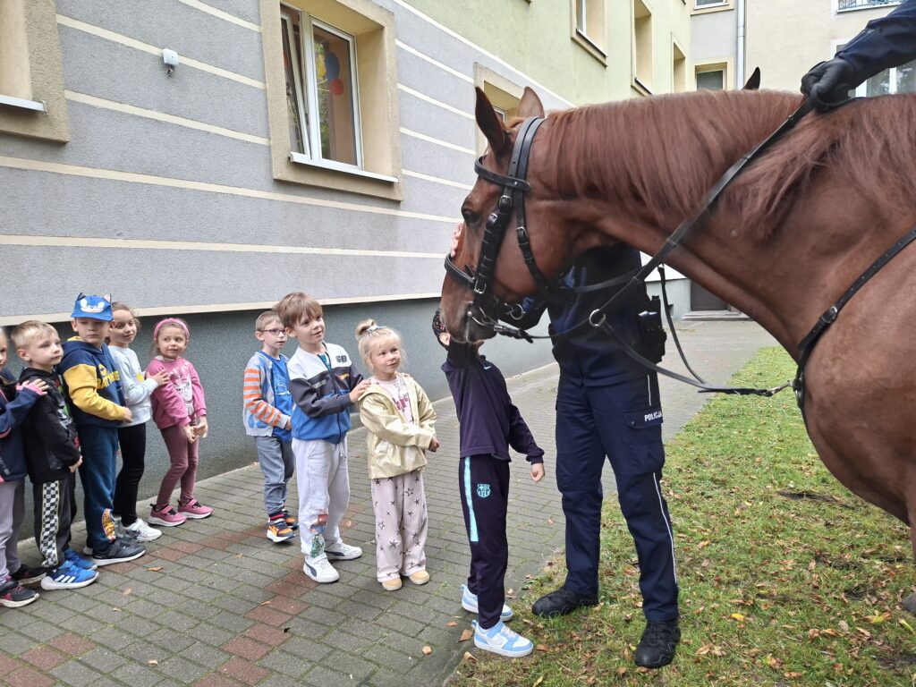 Dzieci miały wyjątkową okazję zobaczyć konie z bliska, pogłaskać je i nakarmić, dowiedzieć się, jaką rolę pełnią w pracy Policji, uczestniczyć w prelekcji na temat bezpieczeństwa i zawodu policjanta.